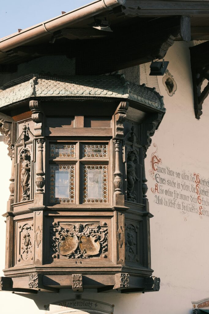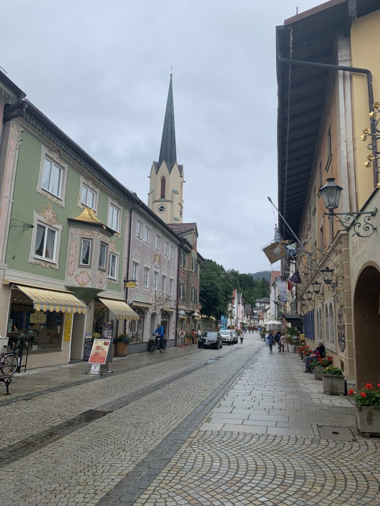 A large church steeple dominates the town and the entire area feels very historic due to the lüftlmalerei (murals depicting different stories) coloring the walls of each building.