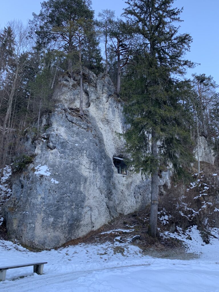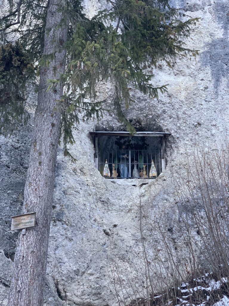 The hole is very concealed and imperceptible behind the trees until you literally stumble right on it. The entire area is a unique, protected religious site where pilgrims and climbers will appeal to God and draw strength from his likeness  before their ascent of the Kramerplateauweg.